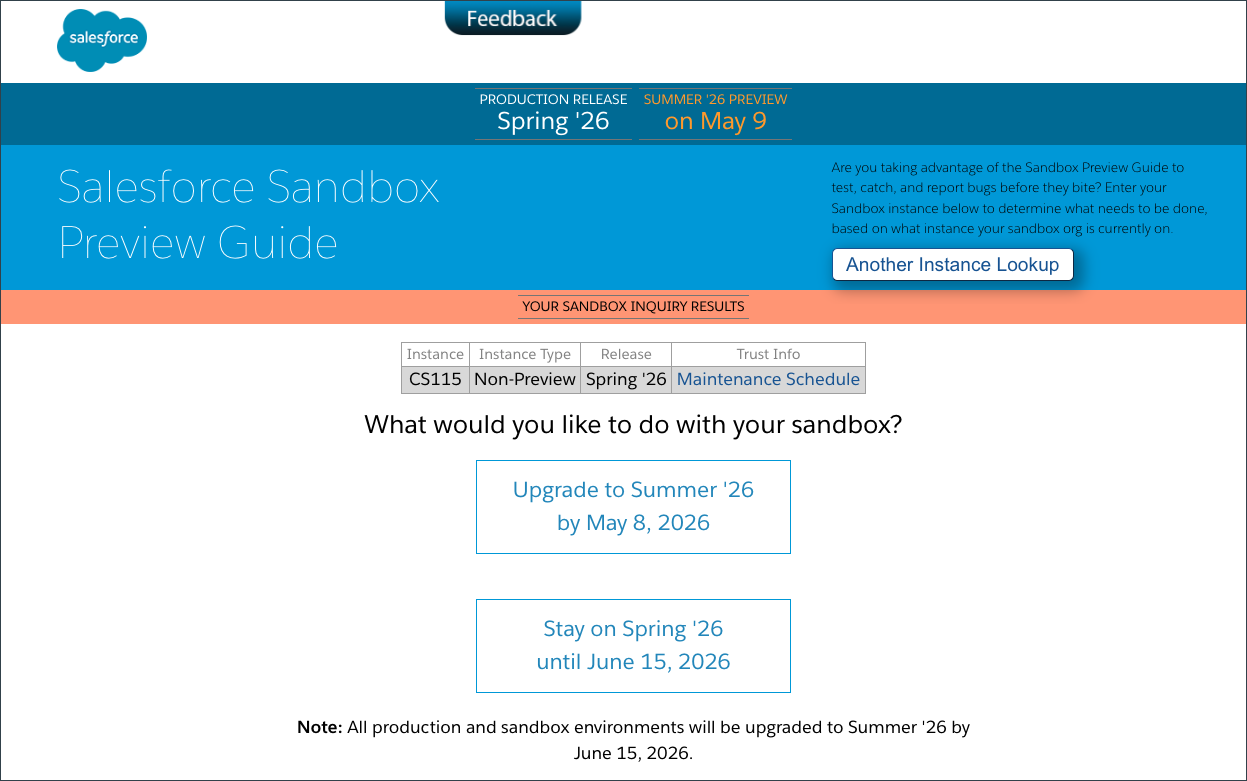 Check the Maintenance Calendar for exactly when your Salesforce org will get the Summer ’26 features. Scroll through the list and check your Salesforce instance (NA__, EMEA__) against the release dates listed in the calendar. Once the release window has passed for your environment, you’ll have access to the newest features in your production environment!